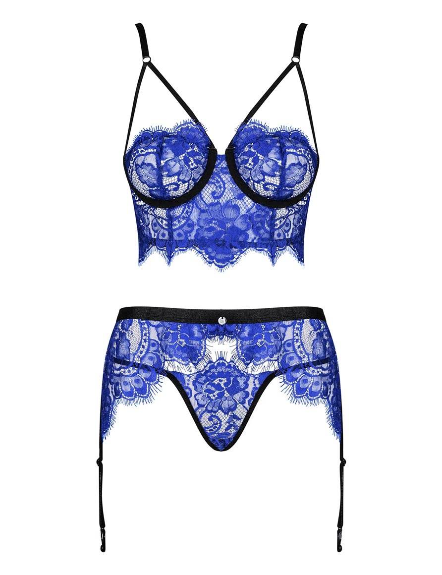 Бюст с мягкими чашками на каркасах, подчеркивает естественную форму груди, бретели регулируются по длине, на спине многоступенчатая застежка на крючки. Элегантный пояс с несъемными регулируемыми пажами для чулок, фиксируется застежкой. Трусики стринги с узкими боковинками из эластичных союзок.