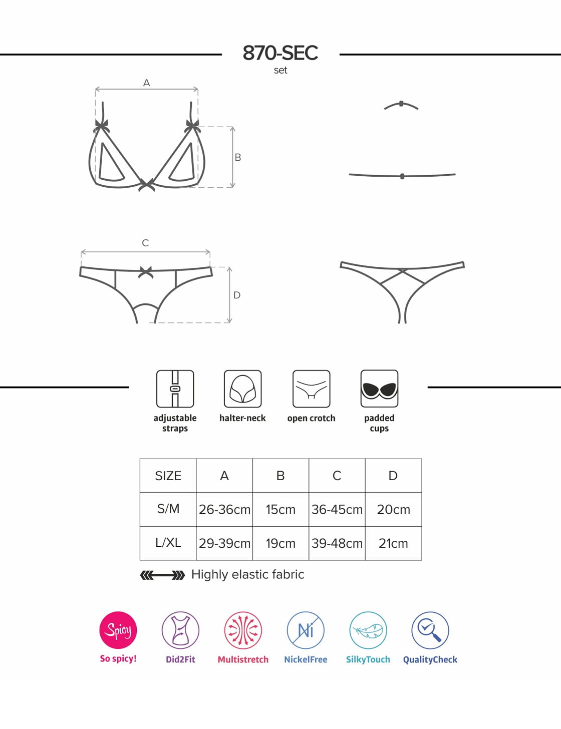 Бюстгальтер с открытыми, уплотненными снизу чашками, без косточек. Застежка на шее и спине с регулируемой посадкой. Трусики стринги с открытым доступом в шаге.