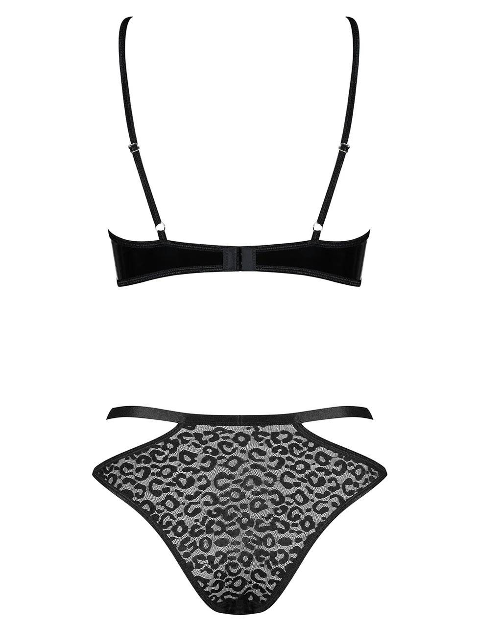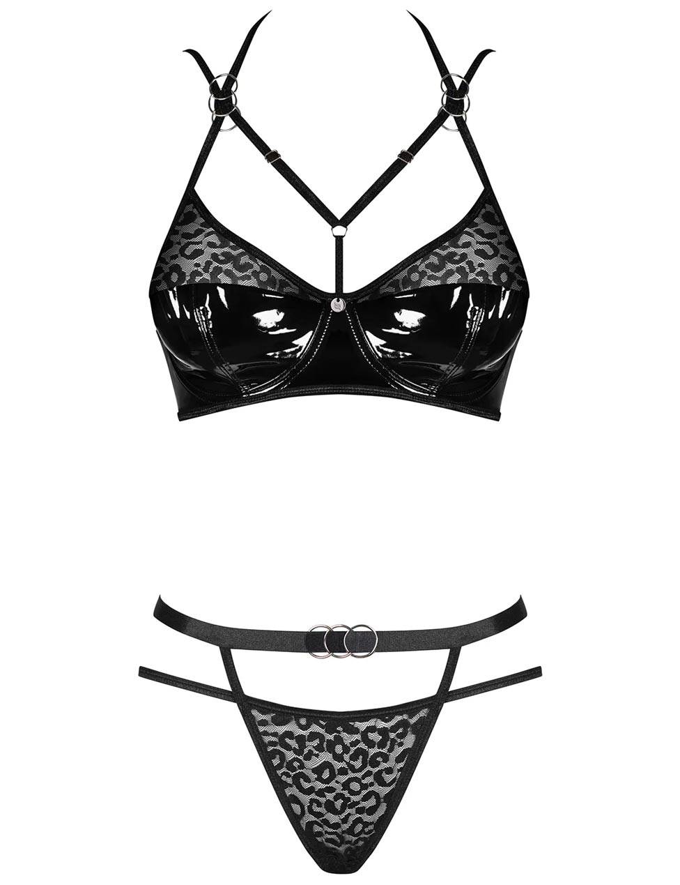 Бюст с мягкими чашками на каркасах, подчеркивает естественную форму груди. Тонкие бретели регулируются по длине, на спине многоступенчатая застежка на крючки. Зону декольте украшает элегантный регулируемый чокер, соединенный с бретелями декоративными кольцами. Деликатные трусики оригинального кроя, высокий пояс из эластичных союзок с декоративными кружочками.