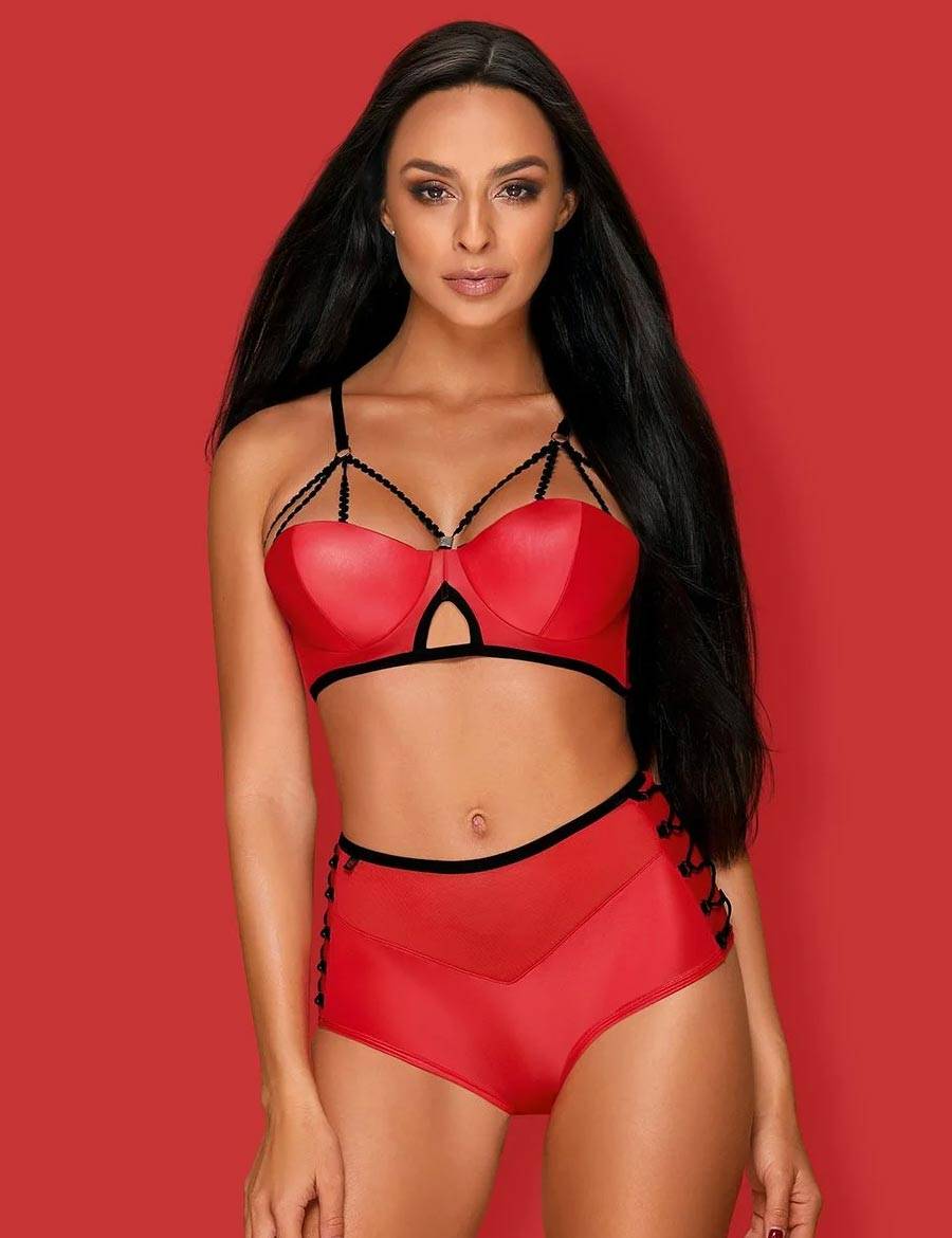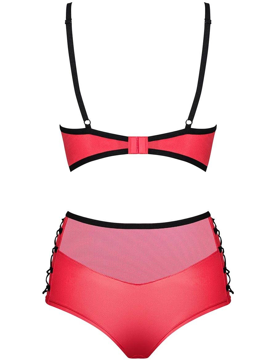Состоит из бюстгальтера с уплотненными чашками на каркасах и трусиков шортов с высокой линией талии и широким боком, с декоративной шнуровкой по бокам. Тонкие бретели с регулировкой длины. Декоративные тонкие полоски по линии декольте - оптически подчеркивают грудь.