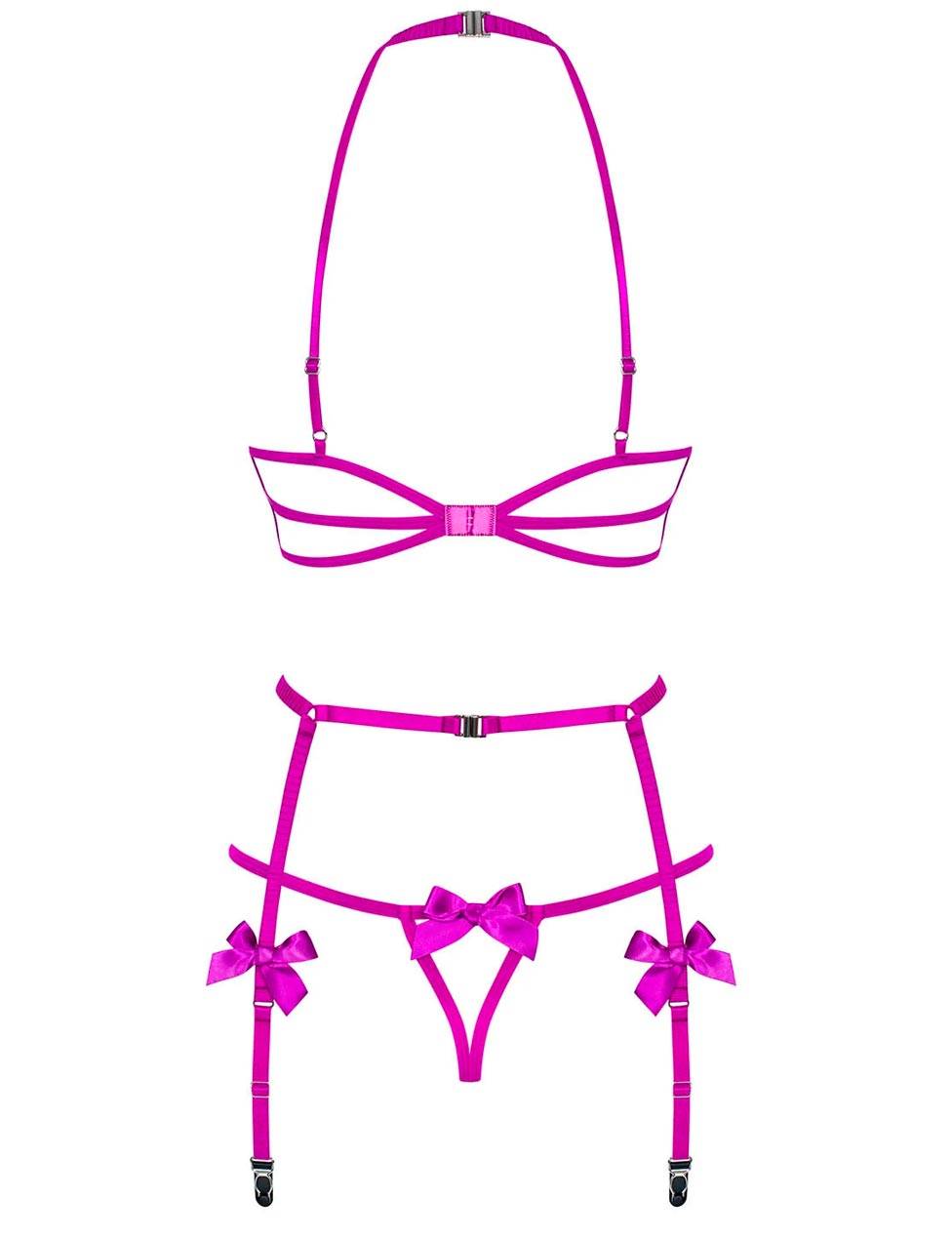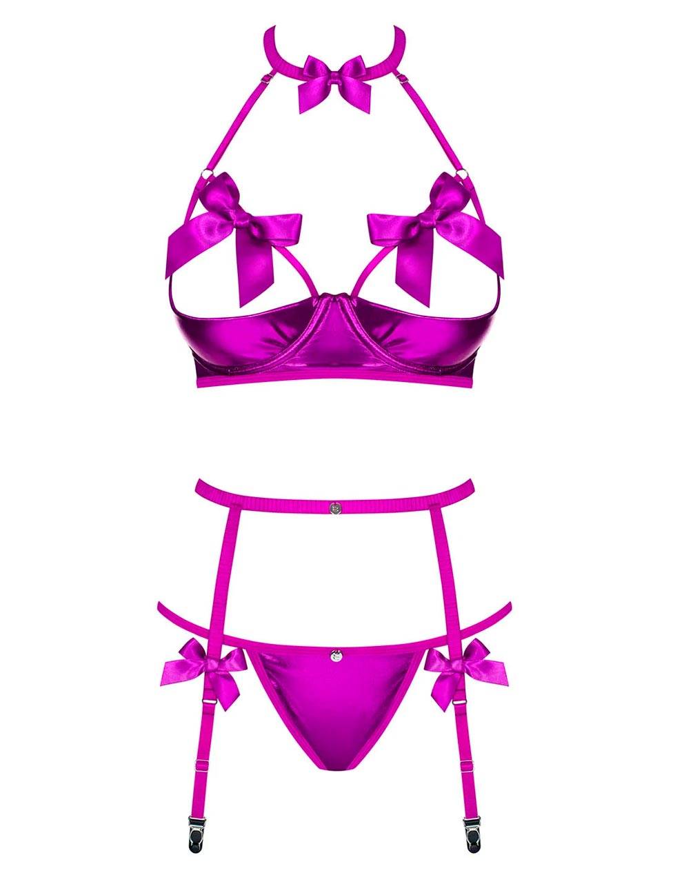 В комплект входят: бюст с открытой грудью, на каркасах; трусики стринги и пояс для чулок. Бретели и пажи для чулок регулируются по длине. Изюминка комплекта - очаровательные игривые атласные бантики.