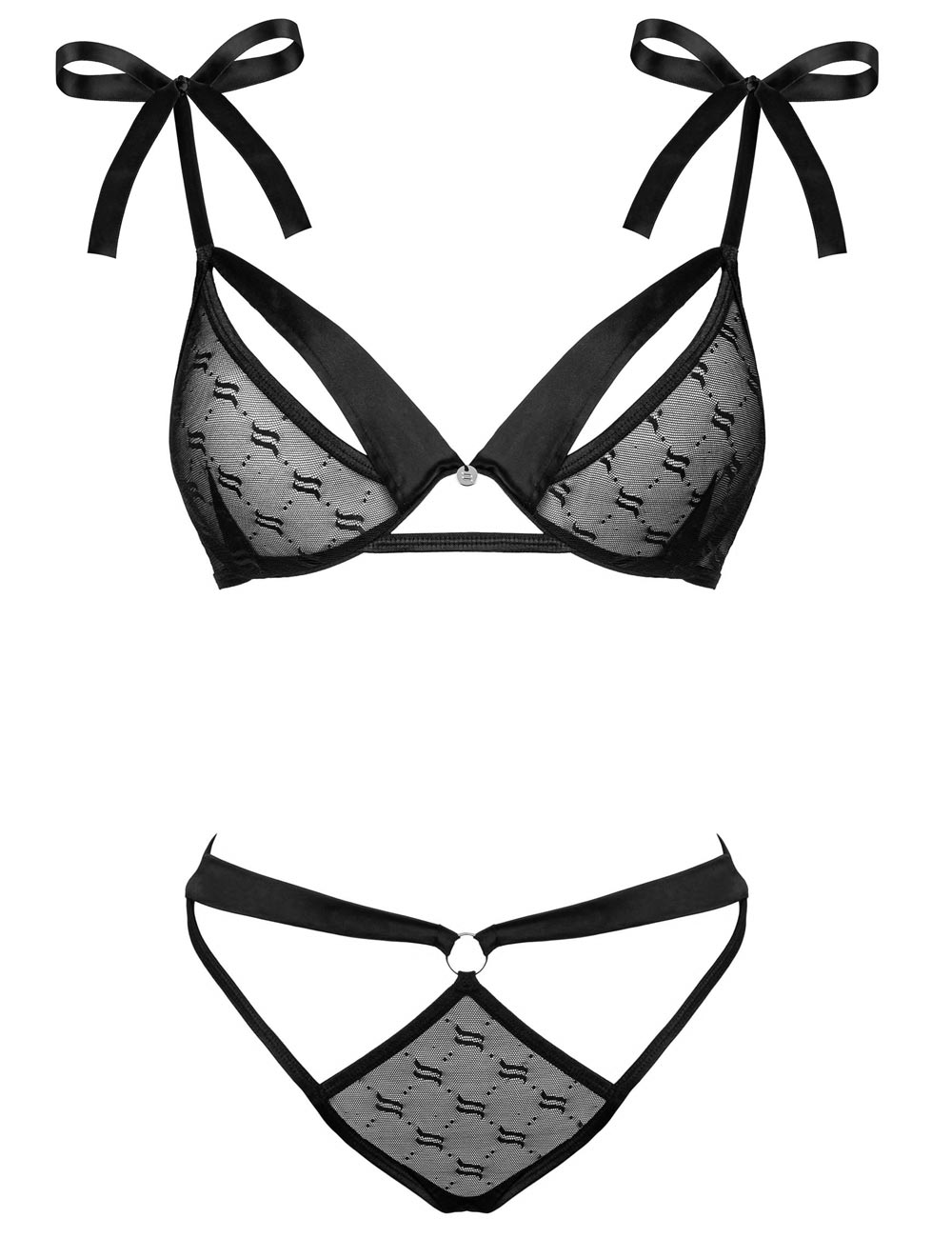 Притягательный чёрный комплект Obsessivia от польского бренда Obsessive состоит из эффектного бюста и оригинальных откровенных трусиков. Выполнен в сочетании полупрозрачного полотна с фирменным логотипом и красивых атласных лент, придающих модели кокетливое настроение.