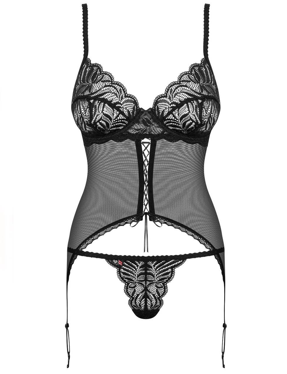 Лиф с мягкими чашками, на косточках, несъемные регулируемые бретели, на спине фиксируется на застежку. Пажи для чулок несъемные, регулируемые по длине.