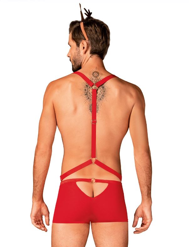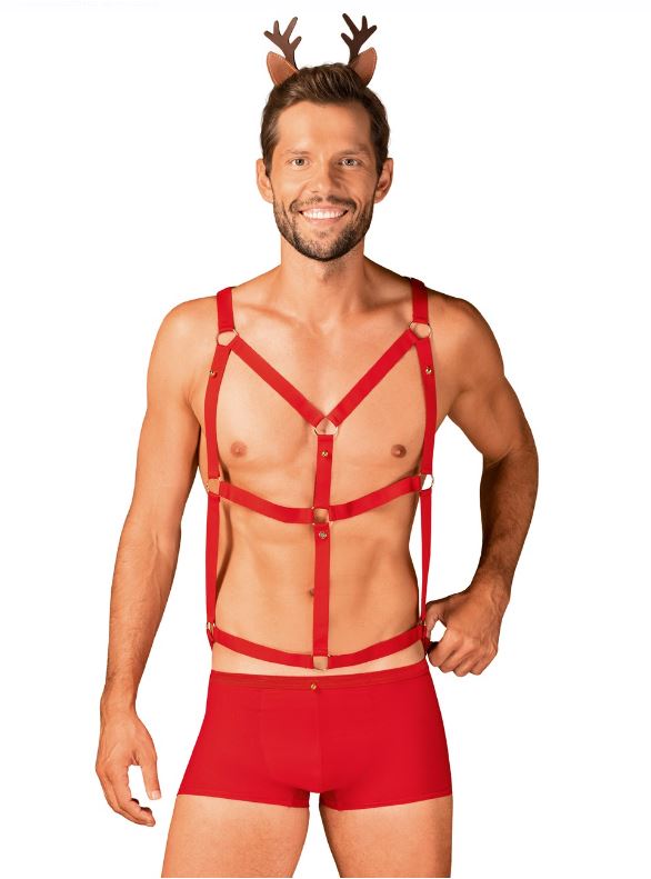 Игривый олененок Санта-Клауса не прочь повеселиться под звон колокольчиков! Пикантная красная шлейка и соблазнительные трусы-боксеры из мягкой сетки - очень сексуальная и чувственная пара, готовая к озорству в спальне. Повязка на голову с оленьими ушками - очаровательный элемент, идеально дополняющий образ. Шлейка регулируется и украшена имитацией саней золотого цвета.