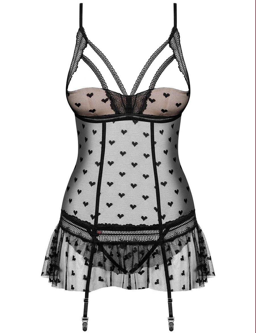 Полуоткрытые уплотненные снизу чашки лифа декорированы эластичными союзками, тонкие бретели и пажи регулируются по длине, фиксация застежка на спине. Линию бедер подчеркнет имитация игривой мини юбочки. В комплекте трусики стринги с пикантным доступом в шаге.