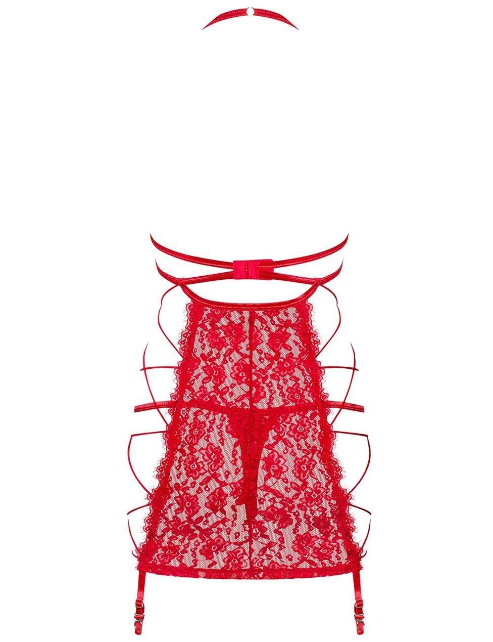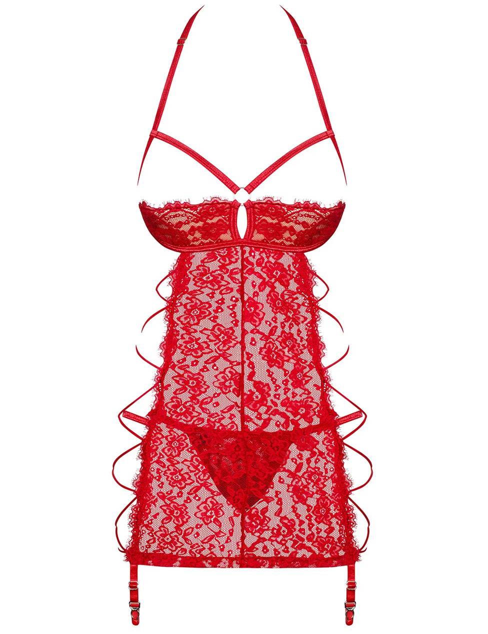 Открытая зона груди с каркасной поддержкой, обрамлена эластичными союзками которые переходят в бретели и застегиваются на шее, на спине застежка. Узкие союзки изящно перекрещиваются по бокам имитируя шнуровку. Пажи для чулок несъемные, регулируются по длине. В комплекте трусики стринги с узкими боковинками.