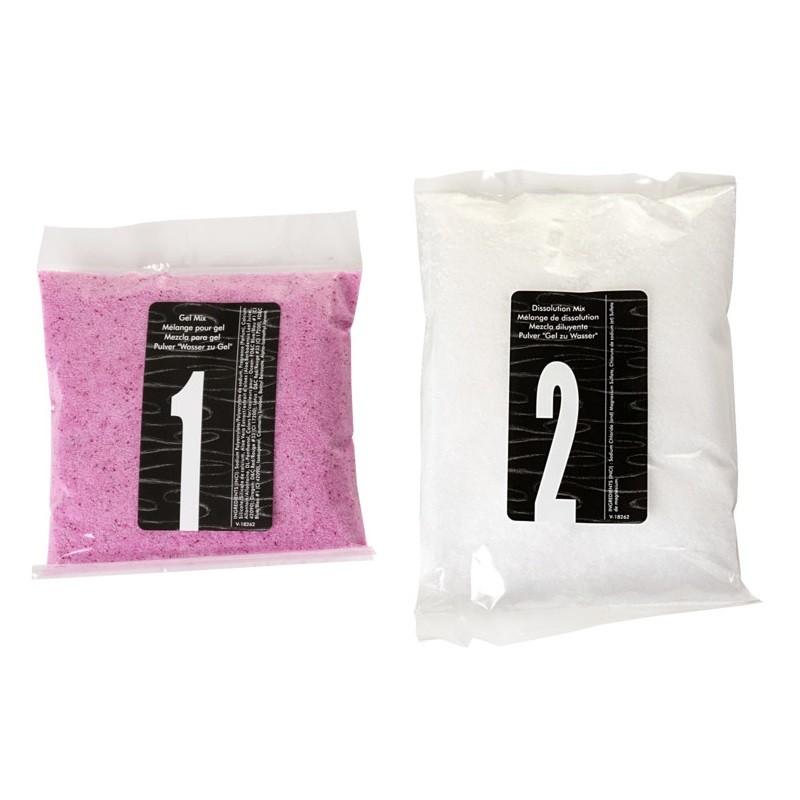 В комплекте вы найдете 2 небольших пакетика со специальными порошками. Содержимое первого пакета необходимо полностью высыпать в воду перед началом волшебного ритуала. В течении нескольких секунд вода окрасится в красивый голубой цвет и приобретет желеобразную консистенцию. Второй же пакетик понадобится Вам только после завершения процесса, чтобы вернуть воде прежнее жидкое состояние.