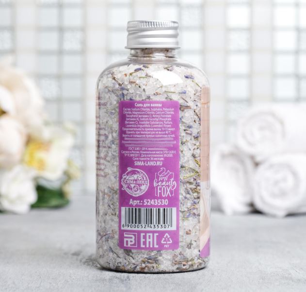 Состав: соль морская, аромамасло, парфюмерная композиция, краситель пищевой.