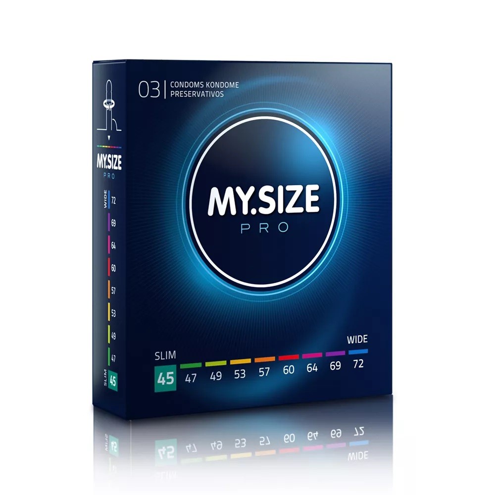Всего MY.SIZE предлагает девять размеров презервативов – от 45 до 72. Цифры означают половину длины окружности презерватива (ширину) в миллиметрах. Размеры 45,47 и 49 считаются уменьшенными по сравнению со стандартным, размер 53 – стандартный, а размеры 57, 60, 64, 69, 72 – увеличенные.