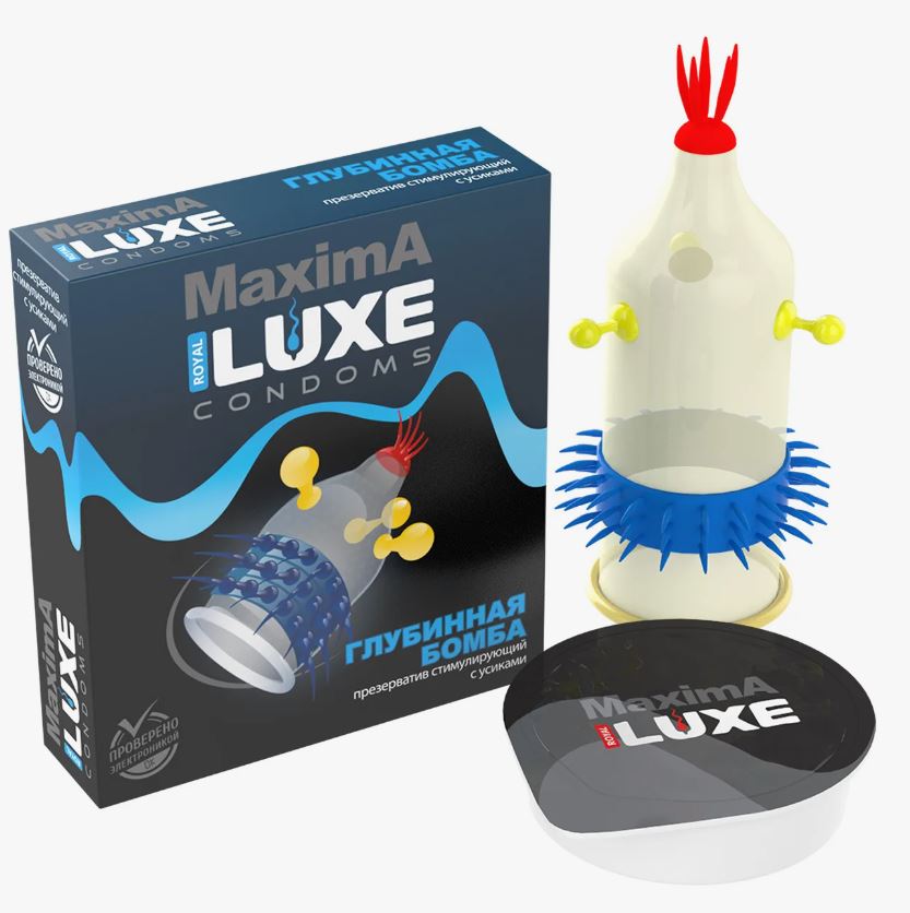 Эксклюзивный презерватив Luxe Maxima Глубинная бомба обязательно порадует влюбленную пару, которая стремится к яркости и разнообразию. На поверхности презерватива есть лента с уплотнительным кольцом и мягкими шариками на поверхности, а также длинные, торчащие в разные стороны усики, которые оказывают дополнительную стимуляцию партнерши.