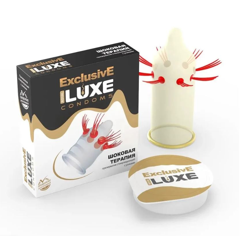 Презервативы Шоковая терапия – это совмещение безопасности и острых ощущений, которые вы можете подарить своей партнерше. 6 пучков красных усиков расположены прямо на верхушке презерватива, поэтому их воздействие женщина будет чувствовать даже в глубинных чувствительных зонах влагалища.