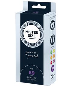 MISTER SIZE — 69 мм (10 шт.), идеальный презерватив. Ультратонкий (0,05 мм) — для максимальной интенсивности. Общая длина: 22 см Диаметр кольца: 6,9 см