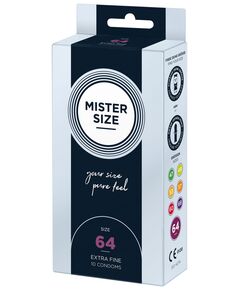MISTER SIZE — 64 мм (10 шт.), идеальный презерватив. Ультратонкий (0,05 мм) — для максимальной интенсивности. Общая длина: 22 см Диаметр кольца: 6,4 см