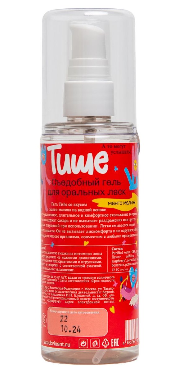 Гель Tishe с ароматом манго и малины на водной основе обеспечивает чувственное, длительное и комфортное скольжение во время близости. Он не содержит сахара и не вызывает раздражения или других дискомфортных ощущений при использовании. Легко смывается водой и не оставляет липкости. Он не вызывает дискомфорта и не нарушает pH-баланс естественной среды вашего организма. Этот гель совместим с изделиями из латекса и игрушками, он позволяет не ограничиваться в выборе интимных аксессуаров. Ощути настоящую свободу вместе с Tishe!