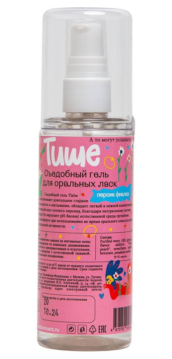 Съедобный гель Tishe с ароматом персика и фиалки обеспечивает длительное гладкое скольжение без липкости и скатывания, обладает легкой и нежной консистенцией. Он имеет естественный вкус сочного персика благодаря натуральному составу. Не содержит сахара! Не нарушает pH-баланс естественной среды организма и не вызывает дискомфорта при использовании во время орального секса или любых других видов сексуальной активности.