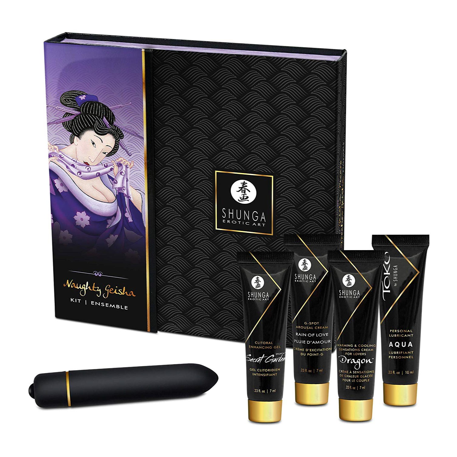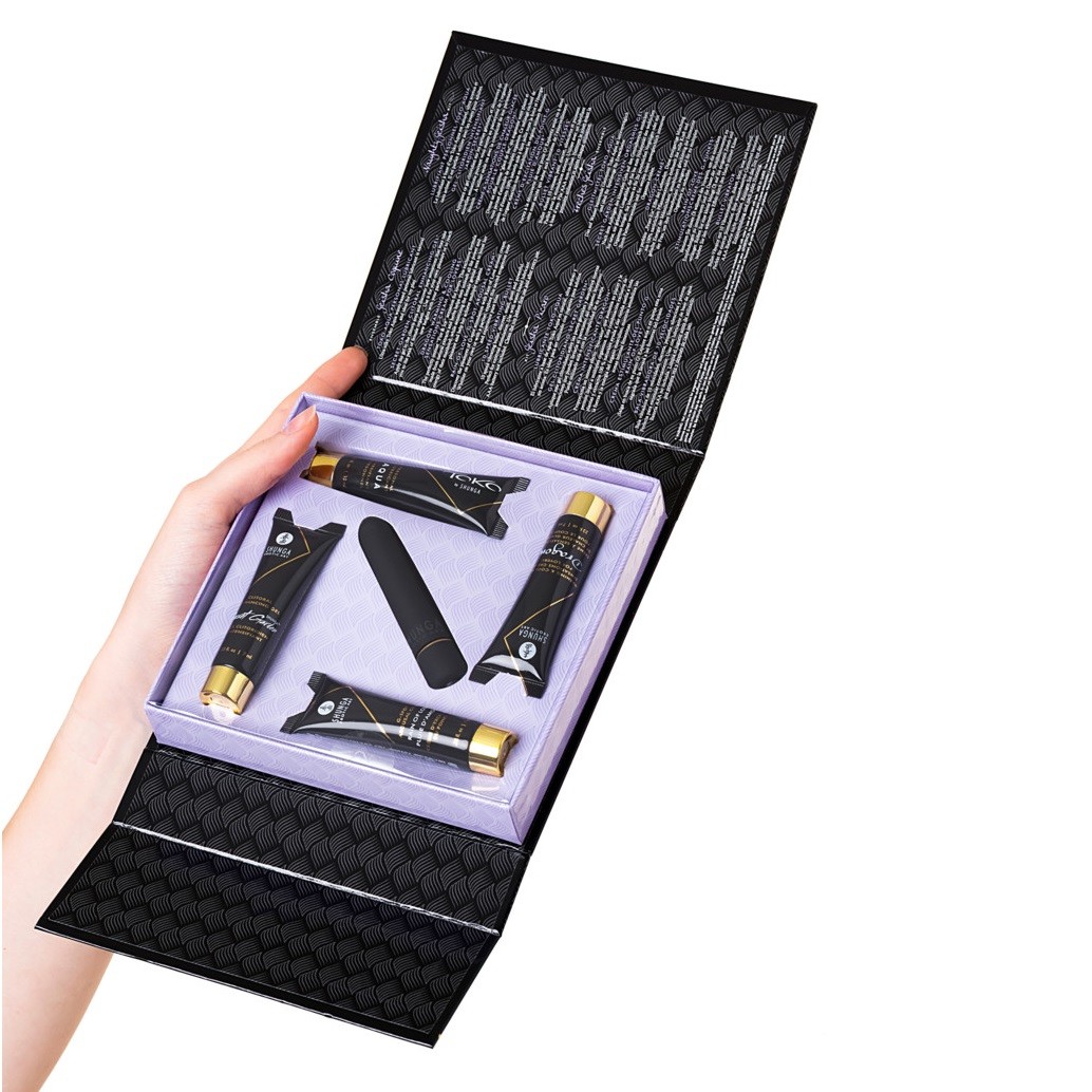 Сет содержит 5 предметов: небольшой вибратор, поддерживающий 10 скоростных режимов, и 4 тубы с различной интимной косметикой.