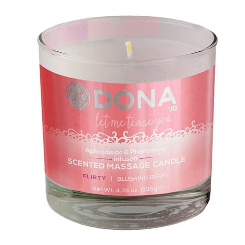 Массажная свеча с феромонами и афродизиаками 'Флирт' DONA Scented Massage Candle Flirty Aroma: Blushing Berry необходимый атрибут романтического вечера. Нежное пламя и искрящийся оттенок создают эротический полумрак. Манящий аромат феромонов и афродизиаков витает в воздухе, пробуждая обоюдную неудержимую страсть. Всё помещение наполняется теплым опьяняющим ароматом желания. Подождите немного пока растопится соевое масло, погасите пламя любви и на расстоянии от нежного тела, капните каплю волшебного тепла и начинайте массаж. Массажные движения должны быть чувственными: поглаживания, растирания, лёгкие похлопывания. Эротический массаж – это способ налаживания прочной связи между партнерами, ласковые ладошки легко выражают нежность и доверие, столь необходимое в любовных отношениях. После массажа кожа становится мягкой, шелковистой, пропитанной жизненной энергией и обновлённой. Искусственно синтезированный человеческий феромон снимает внутреннее напряжение, улучшает настроение и провоцирует сексуальное возбуждение.